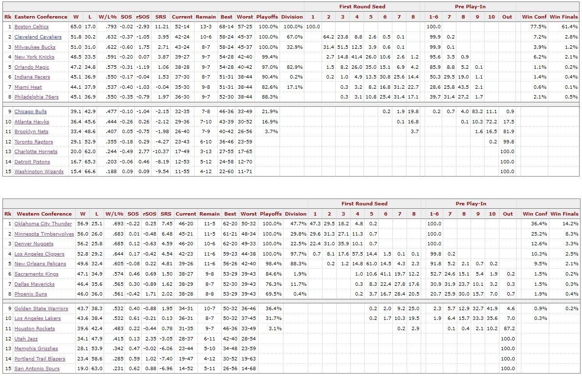 根據(jù)BBR模型模擬預(yù)測,凱爾特人奪冠概率61.4%高居榜首,雷霆14.2%排在第二,森林狼8.3%排在第三。