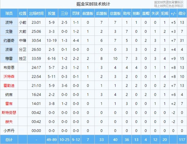 本場比賽,掘金多點開花,10人有得分進(jìn)賬,6人得分上雙,其中約基奇31分、波特13分、穆雷15分、沃特森10分、賈斯汀-霍勒迪13分、布勞恩13分。