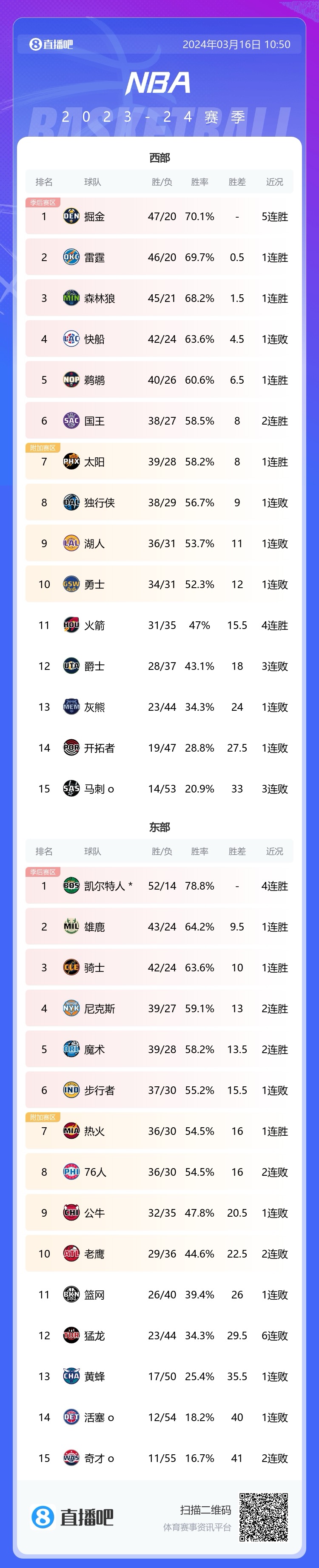 掘金戰績來到47勝20負,再次反超雷霆,升至西部第一。