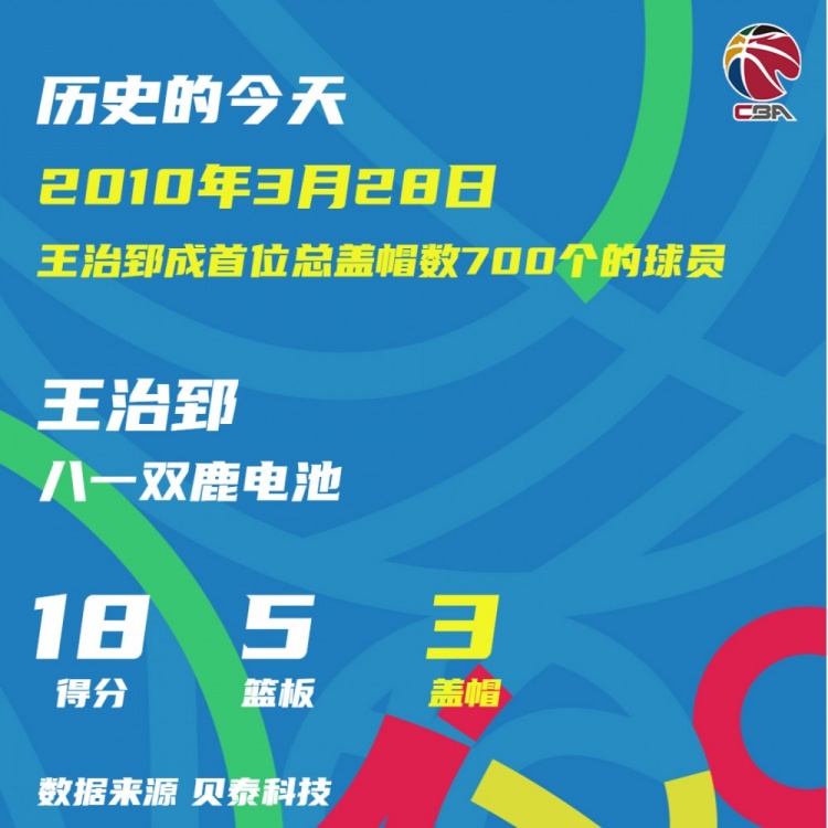 3月28日訊 CBA官博發文,回顧歷史上的今天之3月28日:王治郅成為聯賽首位總蓋帽數達到700個的球員。
