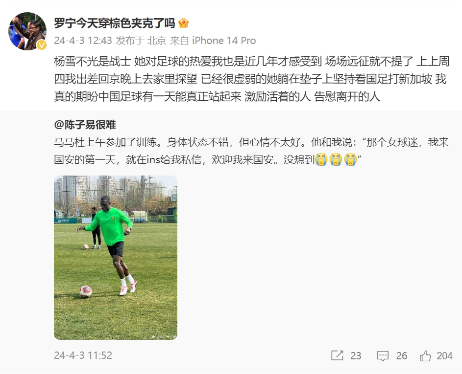 04月03日訊 博主“羅寧今天穿棕色夾克了嗎”更博談離世的北京國安球迷楊雪。