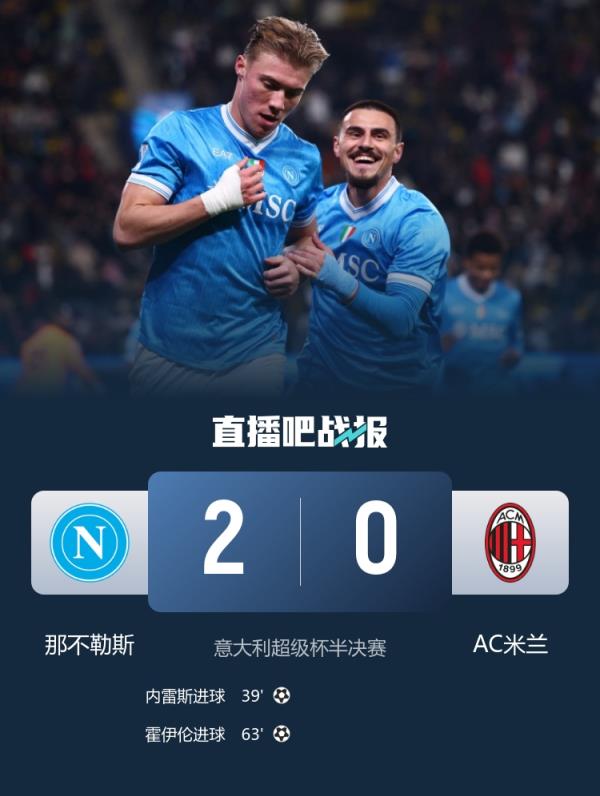 意超杯半決賽,那不勒斯2-0擊敗衛冕冠軍米蘭,挺進決賽,本場內雷斯、霍伊倫各入一球。