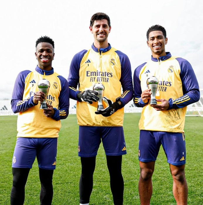 國際足聯年度最佳陣容公布,皇馬球員維尼修斯、貝林厄姆、庫爾圖瓦入圍其中,三人今天在皇馬訓練基地領取獎杯。