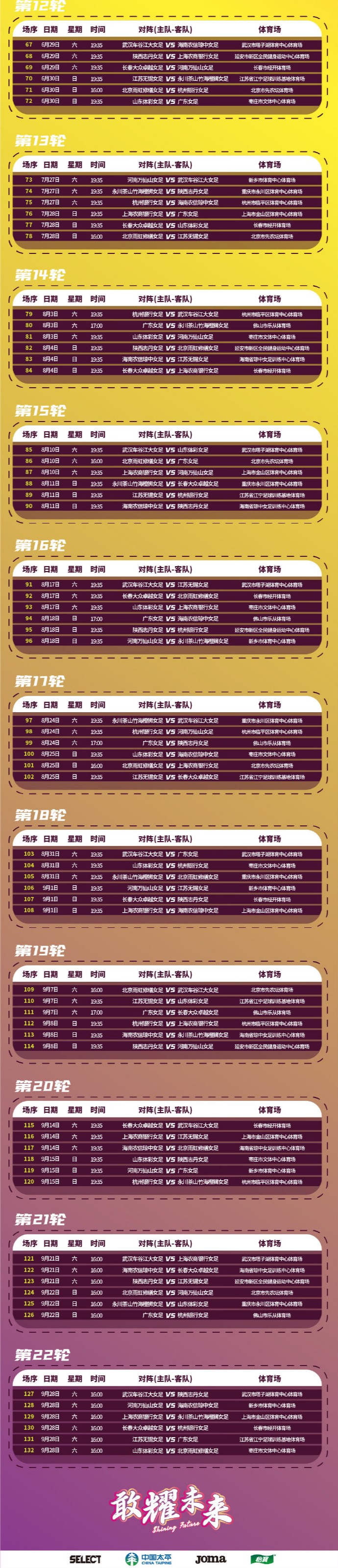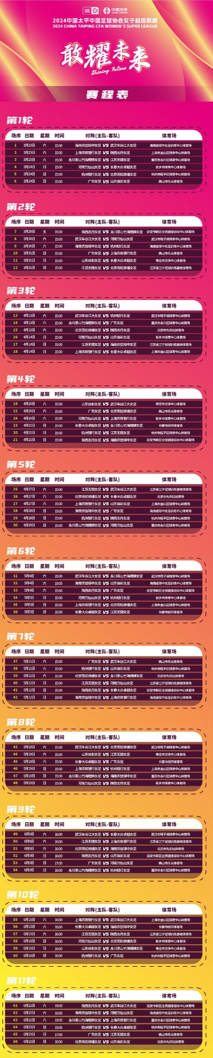 2024女超聯(lián)賽將于3月23日在海南瓊中揭幕,揭幕戰(zhàn)海南瓊中女足vs武漢車谷江大女足。本屆賽事共有武漢車谷江大女足、上海農(nóng)商銀行女足、長春大眾卓越女足、江蘇無錫女足、北京女足、山東體彩女足、廣東女足、杭州銀行女足、永川茶山竹海女足、河南萬仙山女足、陜西志丹女足、海南瓊中女足12支球隊參賽,共進行22輪132場較量。