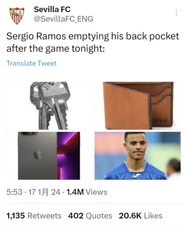 賽后,塞維利亞社媒寫道:“比賽結(jié)束后,拉莫斯從他的屁股口袋里拿出了這些:”下面的配圖是鑰匙、錢包、手機(jī)和格林伍德……