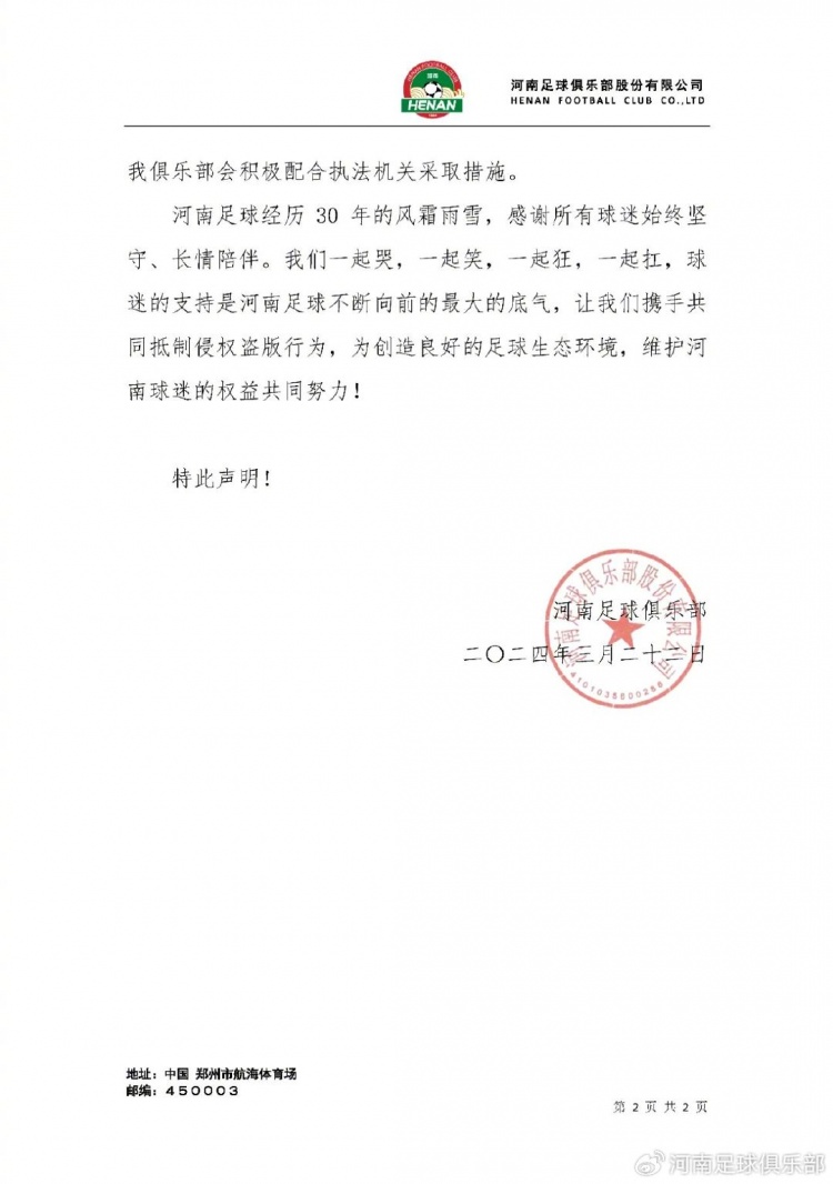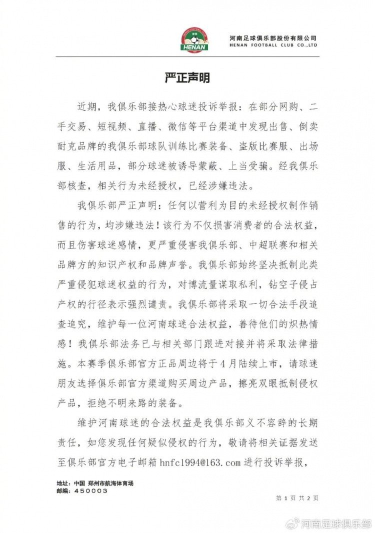 維護(hù)河南球迷的合法權(quán)益是我俱樂部義不容辭的長期責(zé)任,如您發(fā)現(xiàn)任何疑似侵權(quán)的行為,敬請將相關(guān)證據(jù)發(fā)送至俱樂部官方電子郵箱hnfc1994@163.com進(jìn)行投訴舉報,我俱樂部會積極配合執(zhí)法機(jī)關(guān)采取措施。
