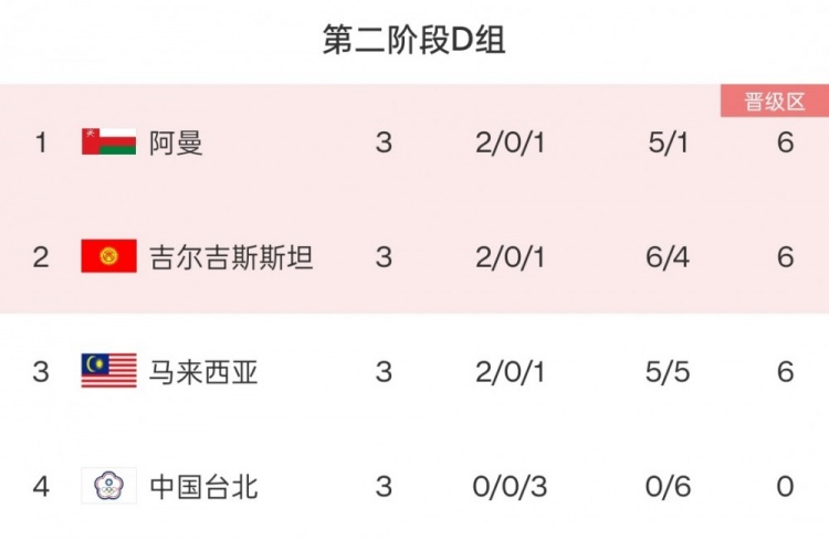 D組:阿曼2-0馬來(lái)西亞、中國(guó)臺(tái)北0-2吉爾吉斯斯坦
