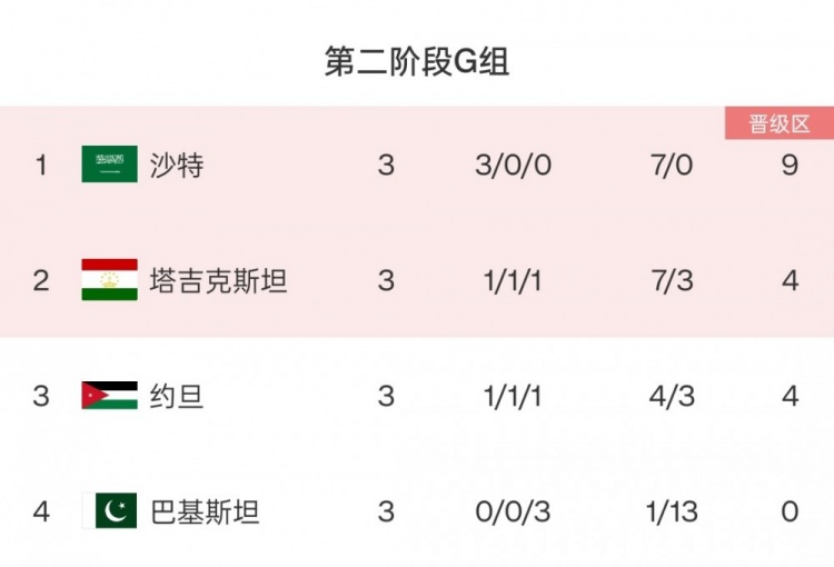 G組:沙特1-0塔吉克斯坦、巴基斯坦0-3約旦