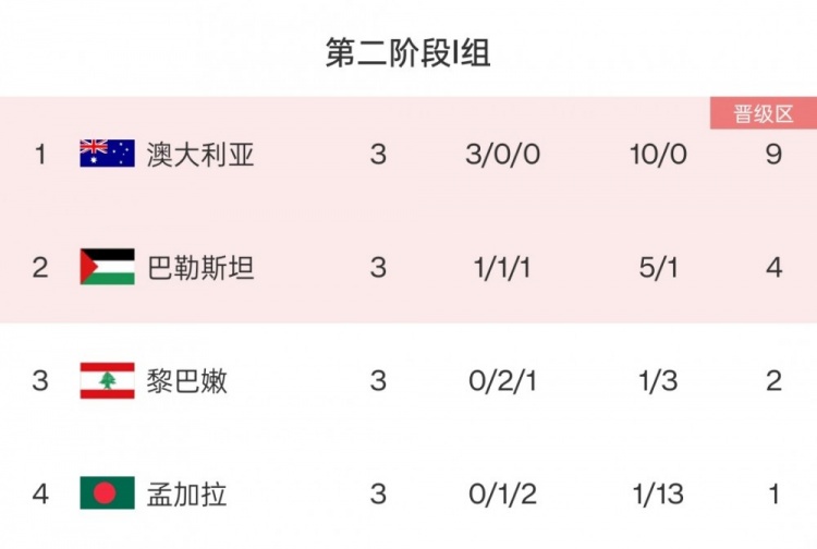 I組:澳大利亞2-0黎巴嫩、巴勒斯坦5-0孟加拉