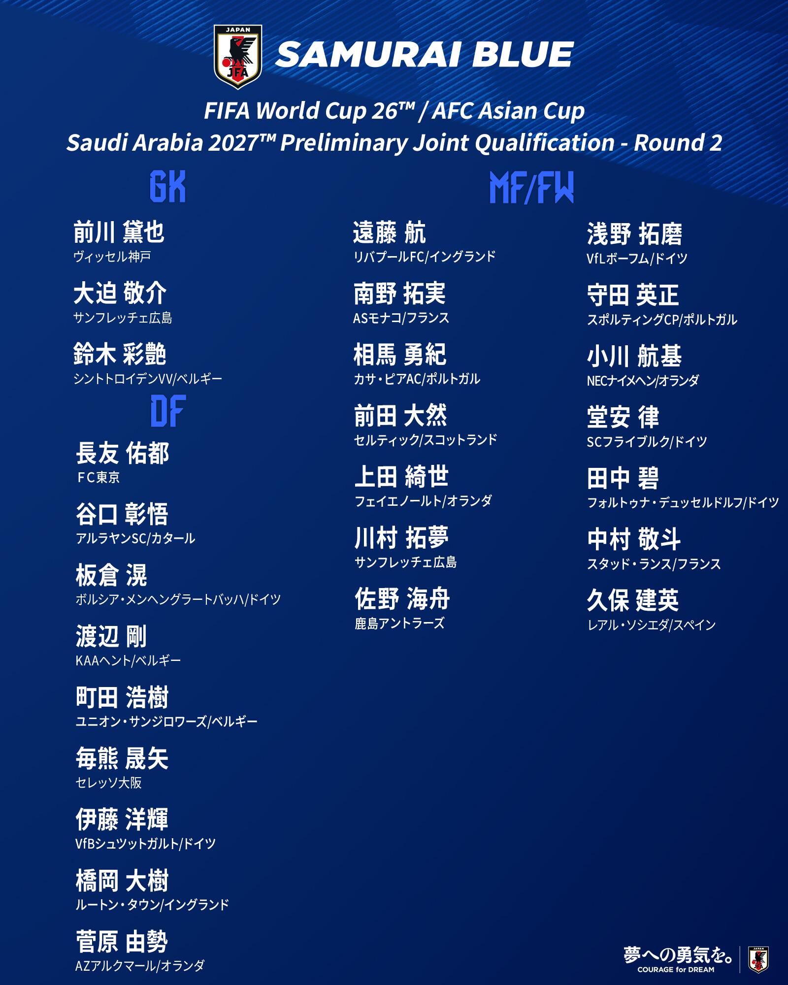 中前場:遠藤航(利物浦)、南野拓實(摩納哥)、相馬勇紀(卡薩皮亞競技)、前田大然(凱爾特人)、上田綺世(費耶諾德)、川村拓夢(廣島三箭)、佐野海舟(鹿島鹿角)、淺野拓磨(波鴻)、守田英正(葡萄牙體育)、小川航基(橫濱FC)、堂安律(弗賴堡)、田中碧(杜塞爾多夫)、中村敬斗(蘭斯)、久保建英(皇家社會)