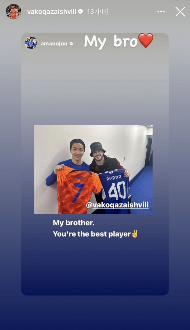 亞冠1/4決賽次回合,泰山客場0-1不敵橫濱水手,總比分1-3止步于八強。賽后,橫濱水手球員天野純在社媒曬出了他與卡扎伊什維利交換球衣的合影并配文:“我的兄弟,你是最棒的球員。”卡扎伊什維利隨即也回復天野純“我的兄弟”,并附上了一個愛心的表情。