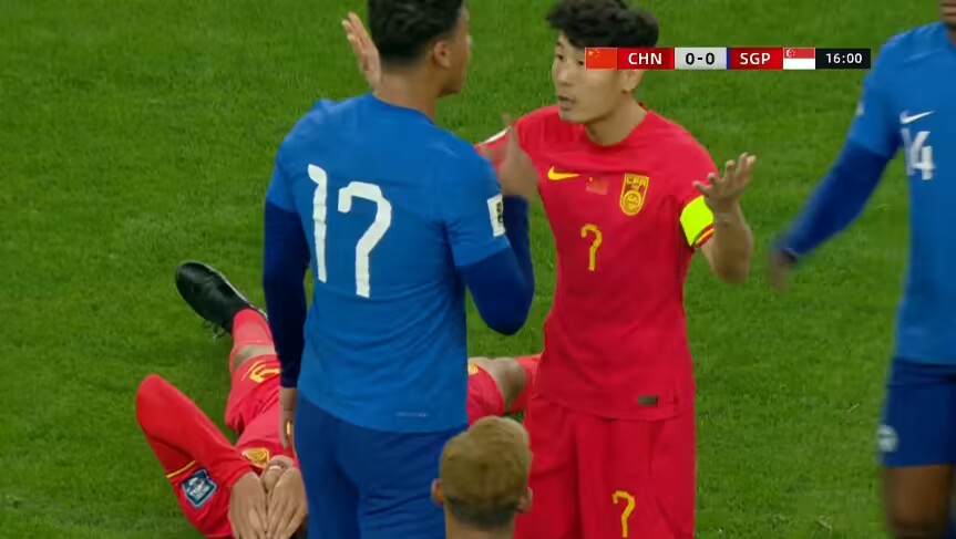 王大雷長傳策動,新加坡球員對張玉寧犯規后與武磊起沖突