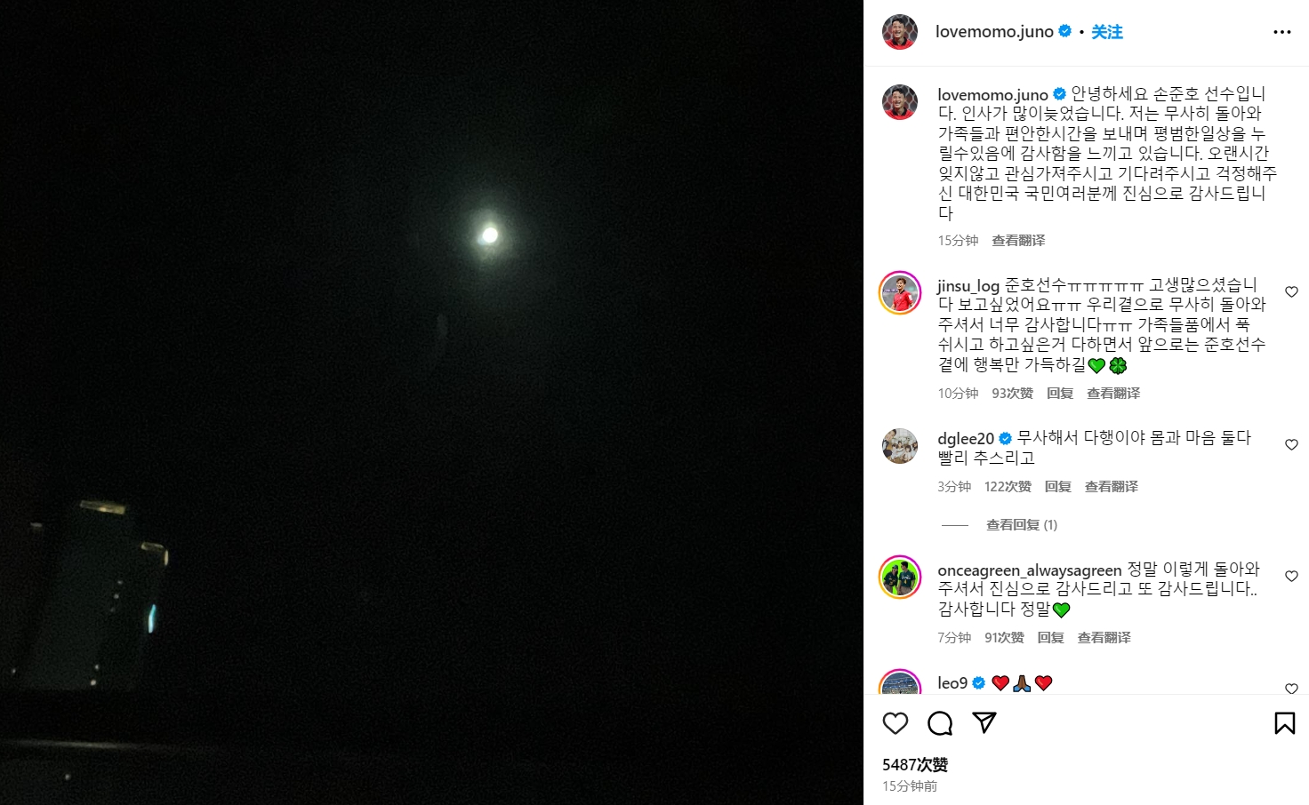 孫準浩曬出了一張月亮的照片,寫道:大家好,我是孫準浩。很抱歉這么晚才向大家送上問候,能夠平安歸來我感到非常感動,可以與家人度過寧靜的時光,并享受普通的日常生活。對于長時間以來始終關心、等待并擔憂我的韓國國民們,我衷心表示感謝。