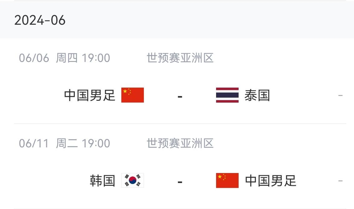 剩下最后兩輪將在6月進行,國足將先主場對陣泰國,再客場對陣韓國。