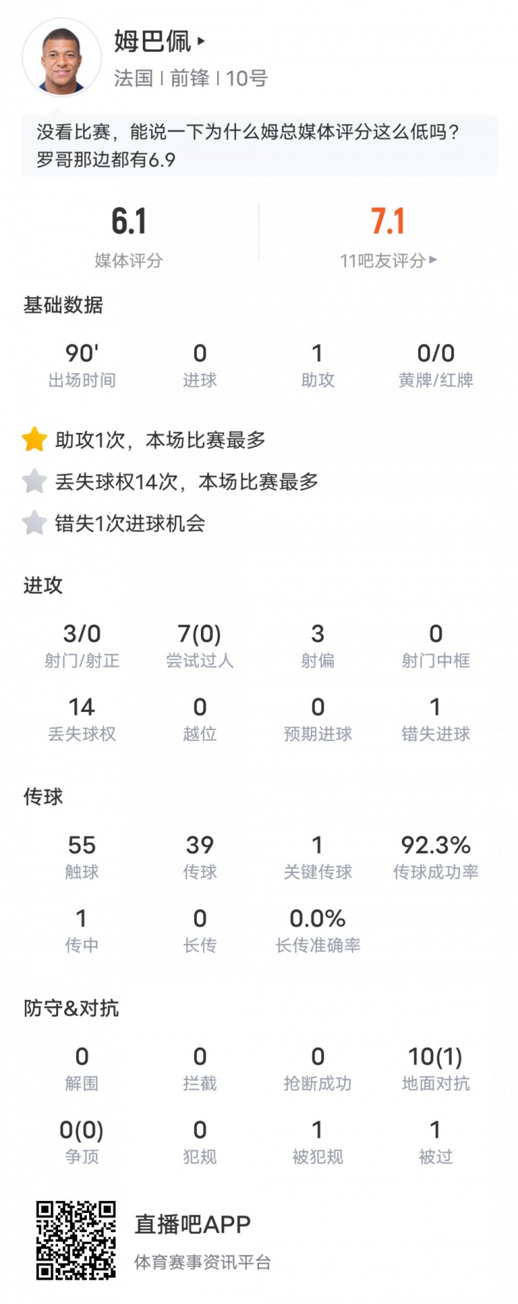 姆巴佩本場比賽數據:1助攻1關鍵傳球&1錯失進球機會,評分6.1