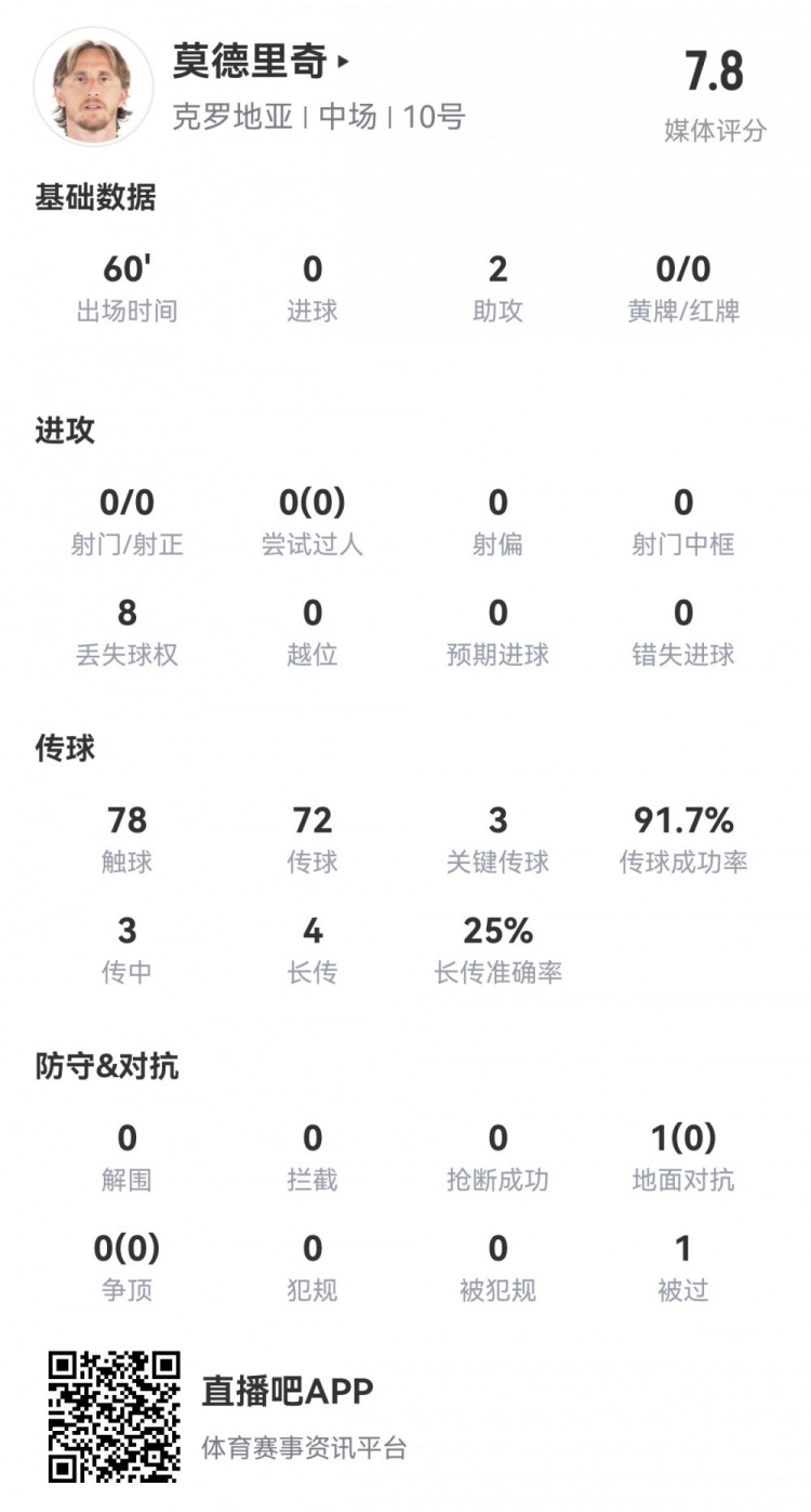 3月27日訊 友誼賽克羅地亞暫4-1客場領先埃及。此役莫德里奇首發出戰60分鐘表現出色,球員全場重點數據如下↓