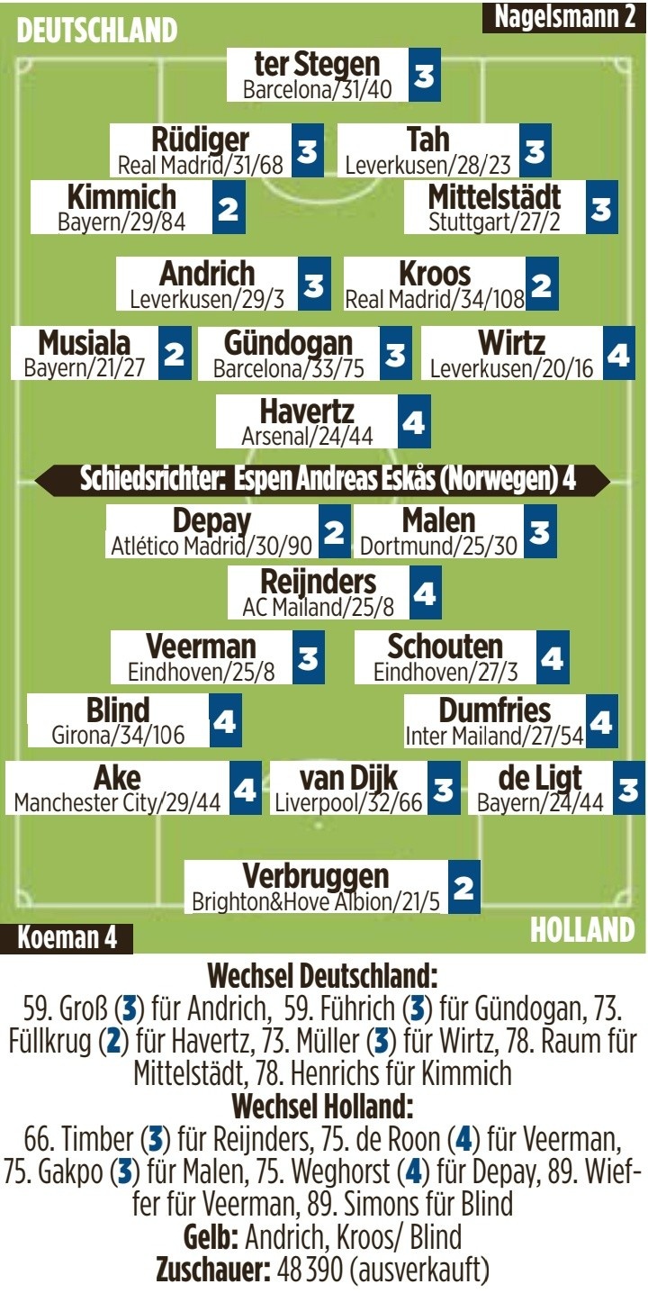3月27日訊 在北京時間今天凌晨進行的友誼賽中,德國2-1逆轉荷蘭,德國媒體《圖片報》為兩隊球員評分,基米希、克羅斯、穆西亞拉、菲爾克魯格、德佩、維爾布魯根2分最高(德媒評分1分最高,6分最低)。