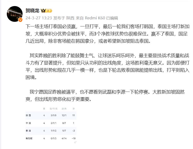 賀曉龍在個人微博中寫道:下一場主場打泰國必須贏,一旦打平,最后一輪我們客場打韓國,泰國主場打新加坡,大概率積分優勢會被抹平,而3個凈勝球優勢也很難保住。贏不了泰國,國足幾近出局,除非客場能在韓國拿分,或者希望新加坡阻擊泰國。