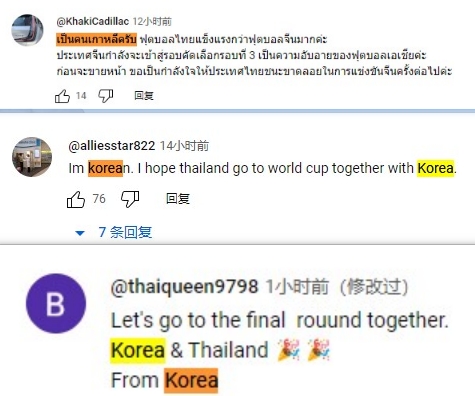 3月27日訊 泰國隊在本輪世預賽主場0-3不敵韓國,在賽后的泰國球迷評論區(qū),多位韓國球迷現(xiàn)身鼓勵對手: