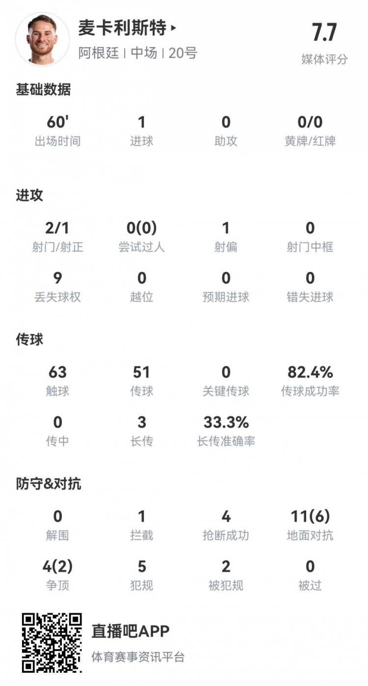 3月27日訊 正在進(jìn)行的友誼賽,阿根廷2-1暫時(shí)逆轉(zhuǎn)領(lǐng)先哥斯達(dá)黎加。麥卡利斯特打進(jìn)反超進(jìn)球后被換下,球員全場(chǎng)重點(diǎn)數(shù)據(jù)如下↓