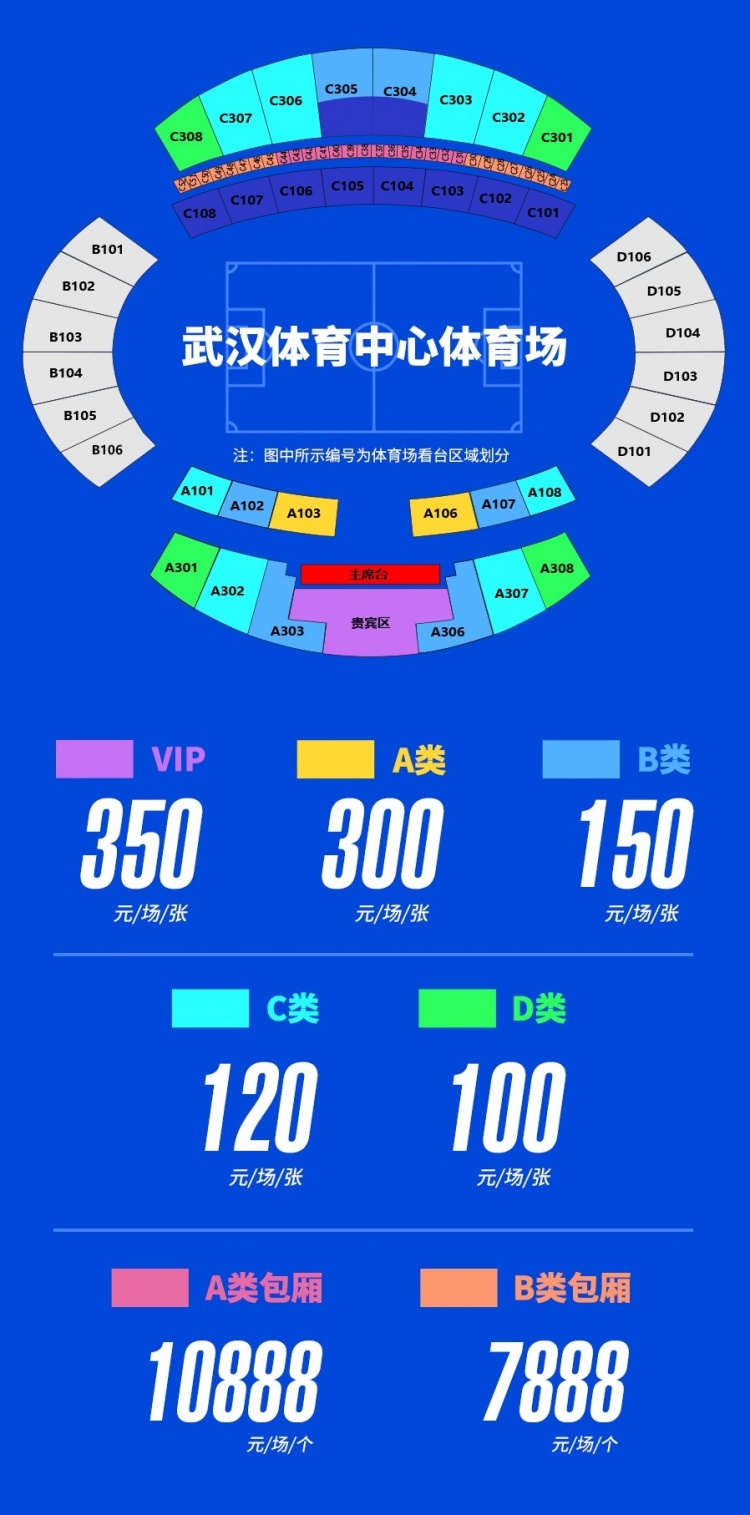 包廂方面,武漢三鎮的主場設置了A類和B類兩種包廂,B類包廂每場7888元每個;A類包廂價格最高,為每場10888元每個。