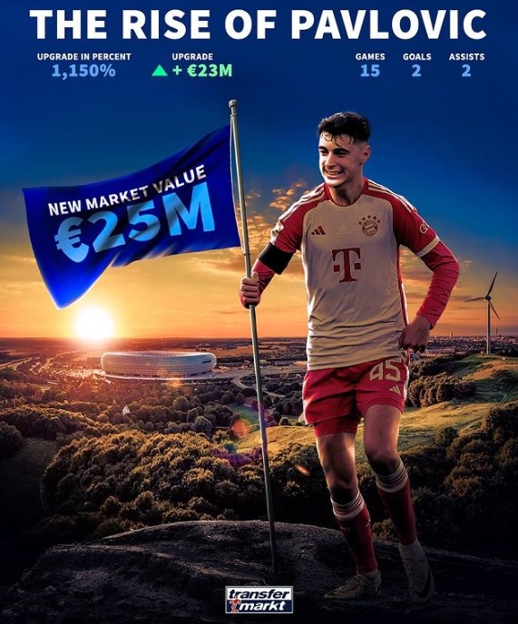 帕夫洛維奇身價(jià)上漲2300萬歐元,相比此前的200萬歐提升達(dá)1150%,當(dāng)前身價(jià)已經(jīng)達(dá)到2500萬歐元。