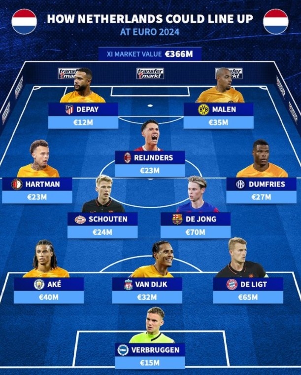 3月28日訊 德國轉(zhuǎn)會(huì)市場(chǎng)網(wǎng)預(yù)測(cè)荷蘭隊(duì)今夏歐洲杯首發(fā)陣容,范迪克領(lǐng)銜,德里赫特、德容、賴因德斯在列,全隊(duì)首發(fā)總身價(jià)3.66億歐元。本屆歐洲杯,荷蘭與波蘭、奧地利、法國同組。
