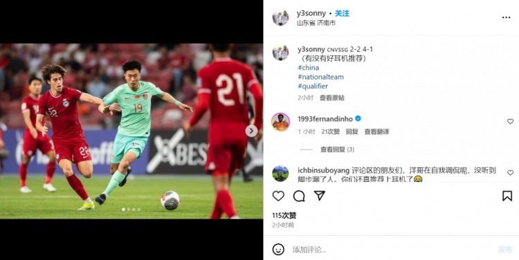 賽后,劉洋更新社媒,自嘲求推薦一款好耳機(jī),王大雷在評論區(qū)寫道:“機(jī)器貓”,韋世豪則評論道:“機(jī)器貓了?”劉洋回復(fù):“我真機(jī)器貓了”,兩人是在調(diào)侃劉洋和機(jī)器貓一樣沒耳朵。