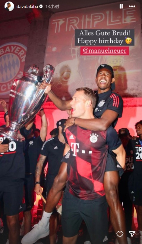 3月28日訊 皇馬中衛(wèi)阿拉巴更新INS動態(tài),祝賀前隊友諾伊爾迎來38歲生日。